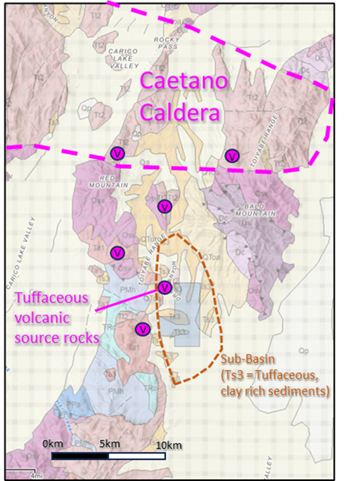 The basin contains numerous geological characteristics associated with the presence of lithium-rich claystones including;